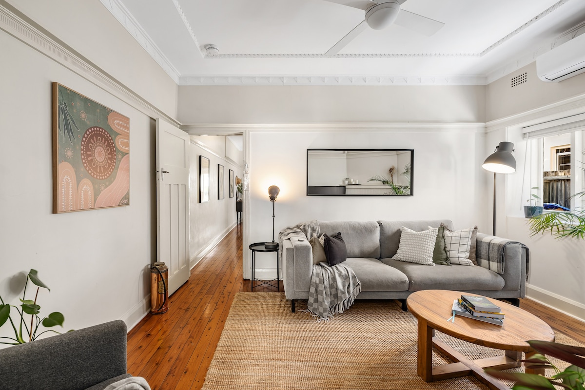 Este apartamento privado e independiente ha sido completamente renovado y es un acogedor «hogar lejos de casa». La casa se encuentra en lo alto de una colina con impresionantes vistas a Coogee y al mar. El apartamento está en la planta baja de una hermosa casa patrimonial de 1915, al otro lado de la carretera de un encantador parque con una zona de juegos para niños y canchas de tenis gratuitas para el público. Desde esta atractiva propiedad en la ladera de una colina, se puede ir andando fácilmente a la playa, cafeterías, restaurantes, bares, tiendas y un cine.