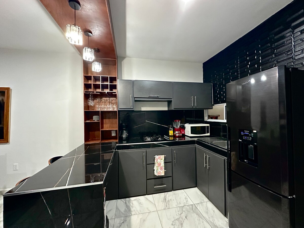 Departamento independiente, colchón King Sice, cocina integral, refrigerador, parrilla doble, campana extractora, microondas, cafetera, tostador, licuadora, vajilla, sartenes, cubietos, botellón Ciel, sal, pimienta, aceite, café, azúcar y leche. Tabla, cuchillos, secadores, plancha y burrito. Sala TV-IZZI, A/C, WIFI, baño completo con agua fría y caliente, toallas, secadora de pelo, papel sanitario y de cocina, shampoo p/pelo, cuerpo y manos, artículos de limpieza, cochera techada y cerrada.