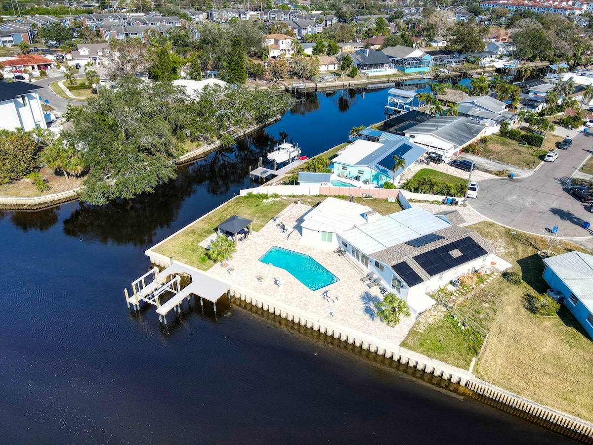 🏠 Welcome to this incredible, stunning & fully updated heated pool & spa home located on a serene waterfront canal of Tampa Bay! Enjoy the dock for fishing & relaxing. Fast WIFI, Samsung Smart TVs, a game room with an air hockey table, ping pong & pool table, and even a Pac-Man machine will make your stay memorable & fun! Most importantly, dive into this amazing heated pool & spa right in front of the canal!