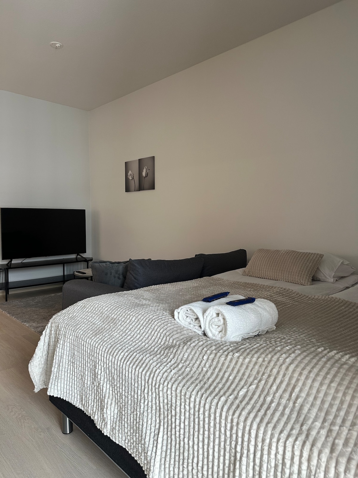 ¡Excelente ubicación en el corazón de Tampere! A solo 50 metros de la entrada principal del nuevo Nokia Arena, a 100 metros de la estación de tren y autobuses. Todos los servicios y atracciones, todos los restaurantes, cafeterías, discotecas, centros comerciales y boutiques a solo unos pasos. El apartamento es nuevo, la casa ha sido construida en 2022. En el apartamento hay una cama tamaño king, un sofá cama para dos personas, un baño espacioso y una zona de cocina agradable y compacta. Mesa para comer y también espacio de trabajo apto para portátiles.