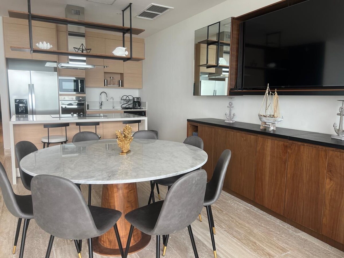 Hermoso departamento totalmente equipado en 3er piso con vista al mar, dos estacionamientos techados. Amplia área social de sala, comedor con bar. Tres habitaciones. Cocina con refrigerador, cafetera, microondas, licuadora y hornito electrico. Sartenes, vasos, cubiertos, platos y de más basicos de cocina. tres recamaras , dos baños completos, AC, TV con cable en sala y cuarto. WIFI en todo el departamento, smart TVs.