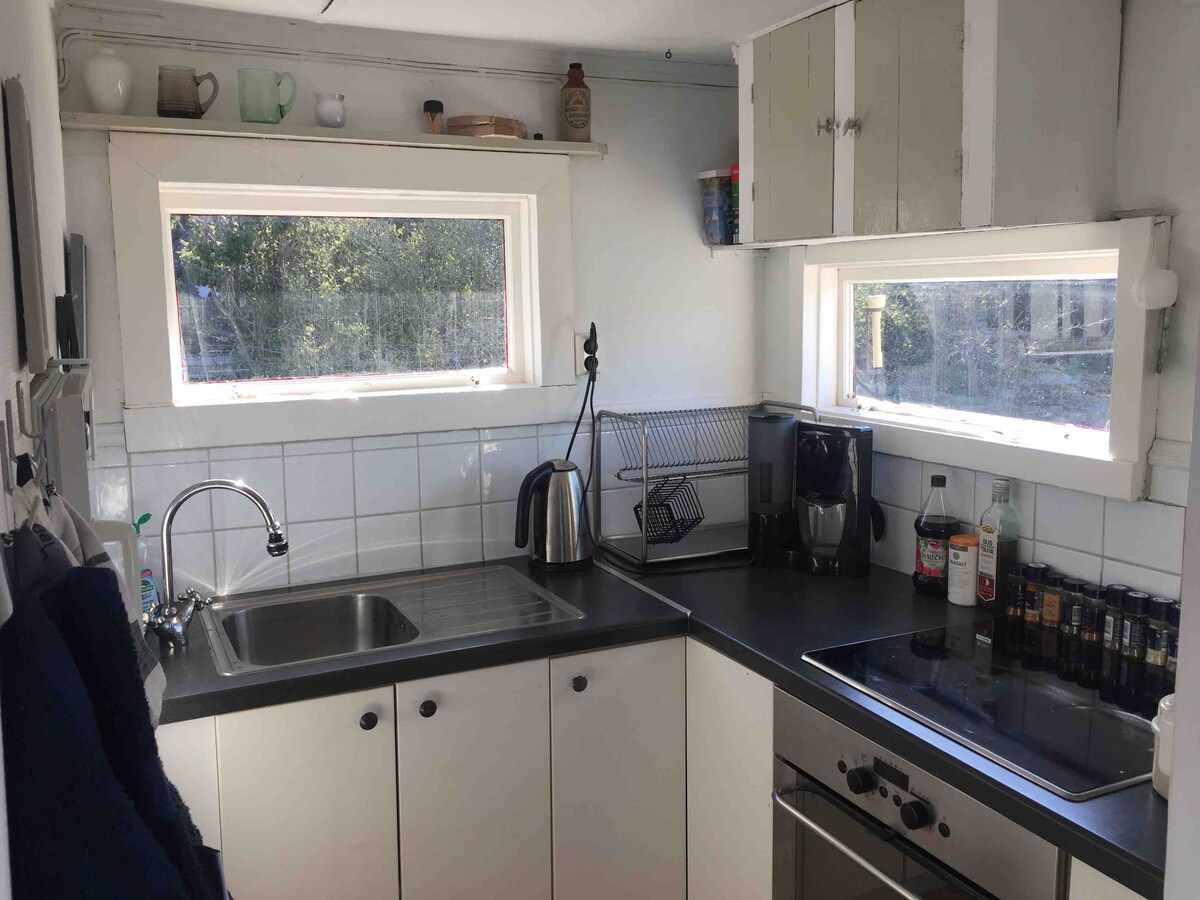 Cocina y salón con sofá cama de 155 cm y vistas al mar. Amplio dormitorio con cama doble de 160 cm. Cocina con horno/placa de inducción, nevera/congelador, fregadero y microondas. Baño con ducha, lavadora y secadora. Balcón y gran patio con césped. Aparcamiento en el exterior. A 10 minutos a pie del agua, con playas, acantilados y un puerto deportivo. El bosque está a 1 minuto detrás de la casa. A 15 minutos en coche del centro, a 10 minutos de las tiendas de Nordby. A 20 minutos de Koster en barco. Zona tranquila.