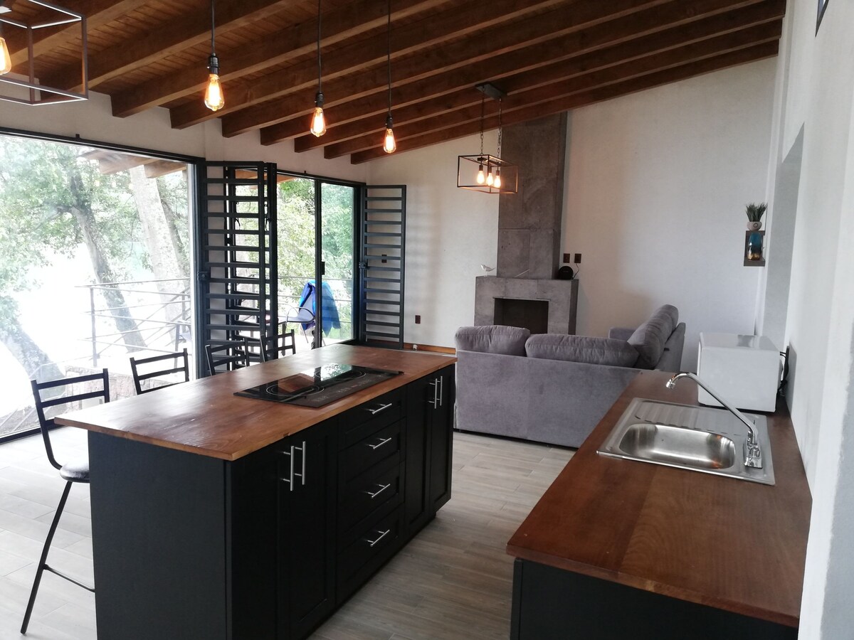 Disfruta una cómoda estancia en una cabaña moderna que destaca la belleza del lago de Zirahuen a través de sus ventanales y agradable terraza que conecta con el área de chimenea