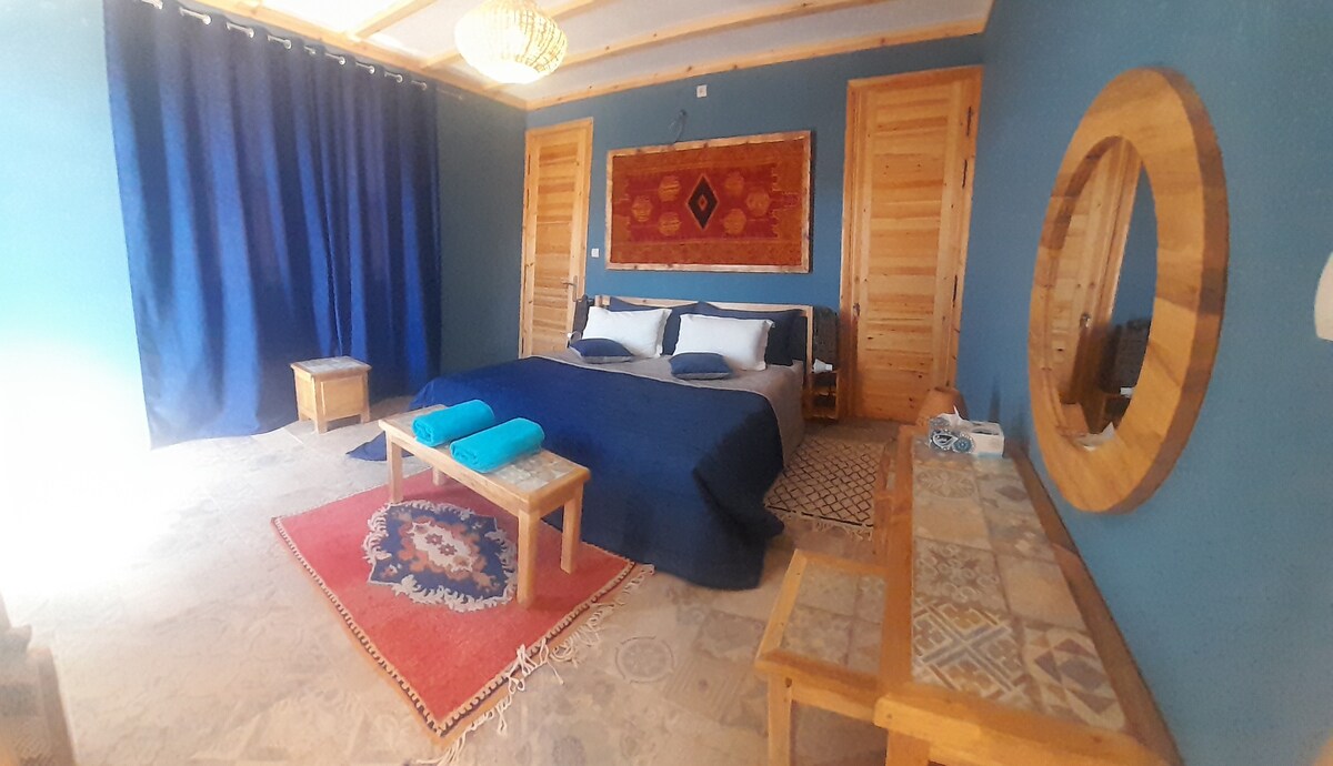 Bienvenue à Dar Bikouch, maison d’hôtes située à Assfalou, un village paisible à 3 km d’Aït Ben Haddou. Loin du stress de la kasbah, profitez de 4 chambres confortables avec salle de bain privée, climatisation, Wi‑Fi et terrasse avec vue. Petit-déjeuner marocain inclus dans le prix. Idéal pour couples, familles ou groupes en quête de calme et d’authenticité dans le sud marocain.