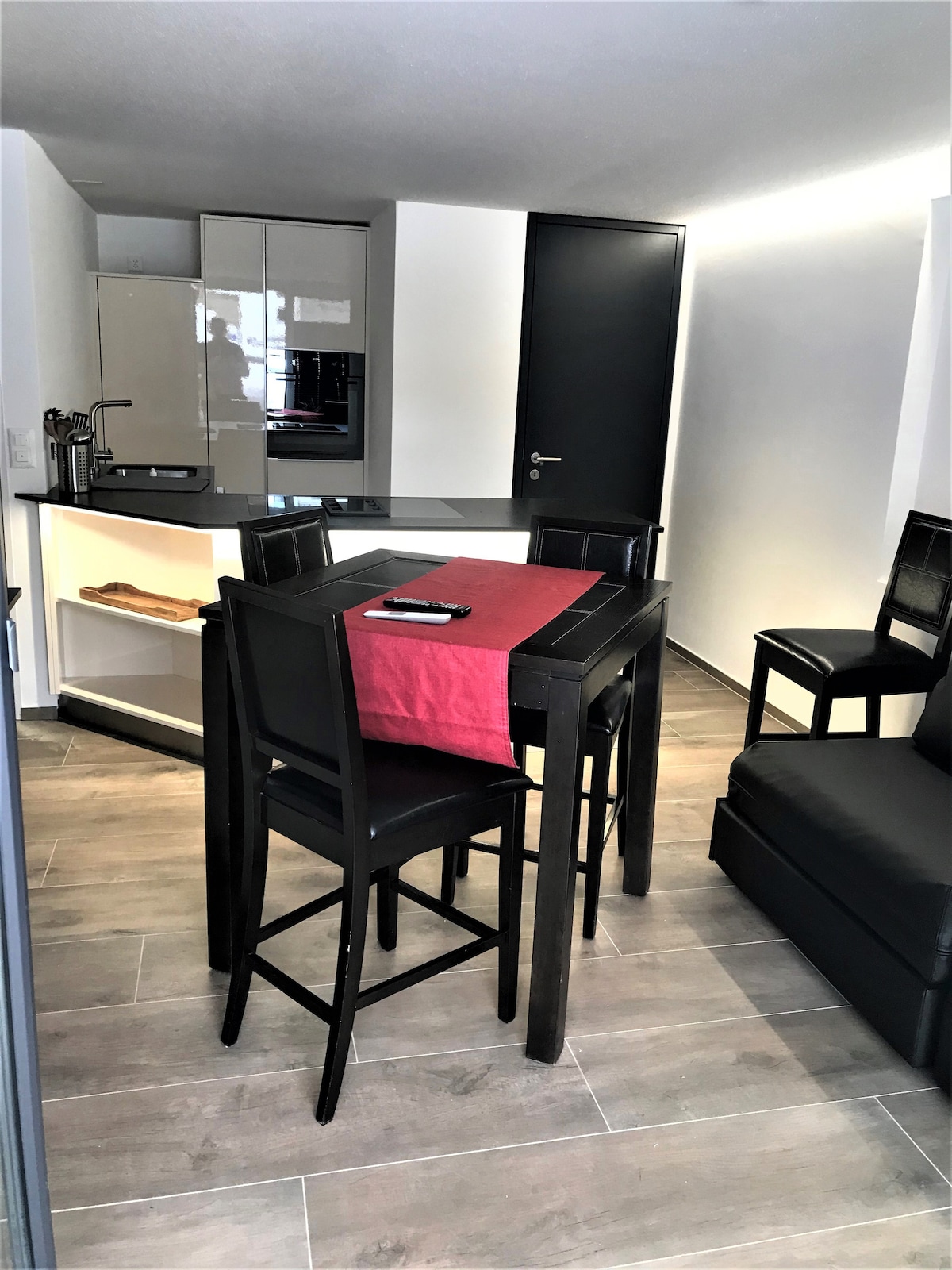 Estudio ático con terraza de 100 m2, vistas ininterrumpidas a los Alpes y bañera de hidromasaje PRIVADA. Espacio interior compuesto por una sala de estar y comedor abiertos con una cama plegable Murphy (180 cm), TV de pantalla grande, baño completo y una acogedora oficina. y en la cocina había de todo. En el exterior, la terraza y las vistas te esperan. Una mesa de comedor al aire libre, una hamaca y un brasero te invitan a relajarte. Acceso cercano a los teleféricos Gemmi y Torrant y a los baños termales.