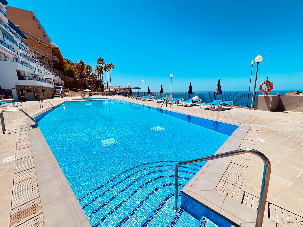 This stylish one-bedroom apartment offers 30m2 OPEN terrace enjoy the SUN all year till sunset with spectacular OCEAN VIEWS, as modern SUPERBLY EQUIPPED kitchen and living room area, COMFORT bedroom and a bathroom with a bathtub. Guests have access to a beautiful swimming pool with Ocean views. Great southwestern hillside in Taurito PERFECT PLACE to appreciate best climat in a relaxing and calm environment. PRIVATE free WiFi&fiber 600Mb/s, multisplit AirCon, 2 TV, soundbar, awning 5x3m, 51 🅿️