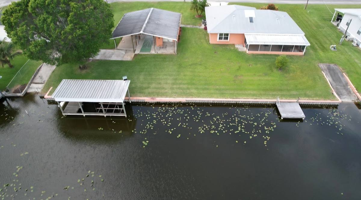 Casa entera frente al mar en el canal de Taylor Creek con fácil acceso al lago Okeechobee. Muelle para barcos, bar tiki privado, gran lanai/solarium, mucho estacionamiento cubierto para vehículos/barcos/remolques, múltiples áreas para comer, cocina totalmente surtida, 2 neveras de tamaño completo, máquina de hielo, congelador, 2 dormitorios/2 baños con bañera-ducha en cada baño, sofá cama tamaño queen en la sala de estar y lavadora y secadora, 5 televisores, ¡incluido uno en el tiki! ¡Entorno tranquilo para que los pescadores y las familias se relajen y se diviertan!