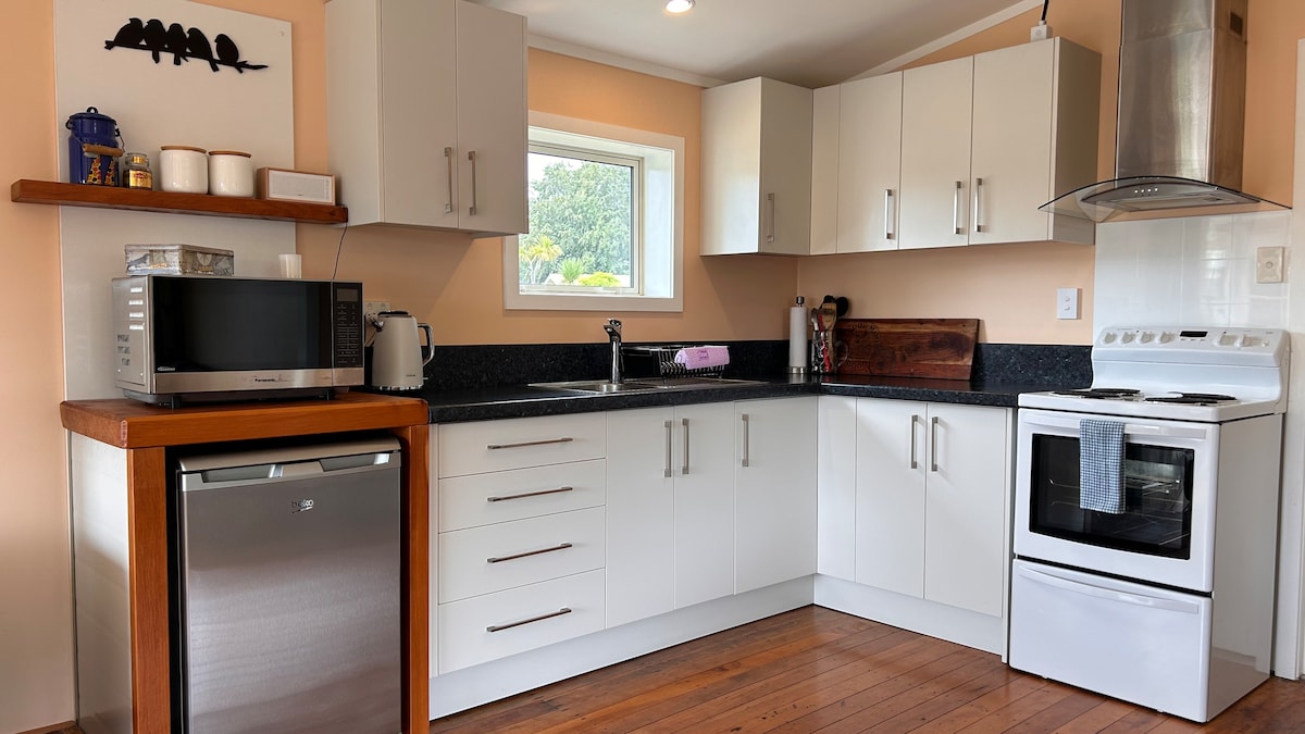 Rodeada de árboles y frente a una reserva, esta cuna de kiwi ofrece una vida interior al aire libre tranquila. Una zona de entretenimiento separada ofrece espacio adicional para relajarte y descansar. Tres dormitorios: dos con camas queen y uno con un juego de literas y dos individuales. A solo cinco minutos a pie del lago y a diez minutos de tiendas y restaurantes. Nuestra cuna NO es de gama alta, pero es un lugar acogedor, cómodo y relajante para hospedarte.