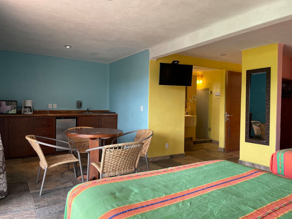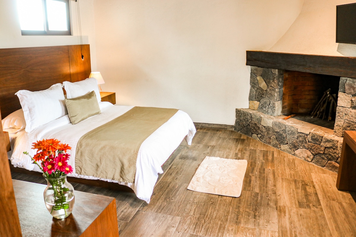 Acogedora suite con cama Queen size, terraza con vista al lago, jacuzzi en el interior de la habitación, chimenea ecológica, tv vía satélite e internet, servicio de restaurante, alberca en el jardín, desayuno incluido y estacionamiento gratis, ubicado en la zona mas céntrica y cómoda del pueblo