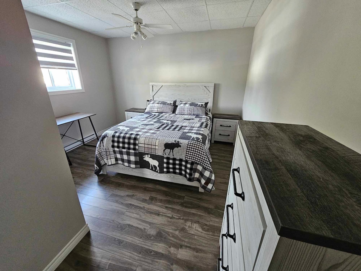Apartamento en la planta superior con dos dormitorios queen, totalmente amueblado, ubicado en el centro de Englehart. El edificio está justo al lado de la tienda de comestibles y a poca distancia a pie de la mayoría de los lugares de la ciudad (arena, hospital, escuelas y campos de pelota). Las rutas de motos de nieve son accesibles y el pintoresco parque provincial Kap-Kig-Iwan está a poca distancia en coche. Lavadora y secadora en el baño. Cocina grande con café Keurig, sala de estar con TV inteligente de 55 pulgadas, chimenea eléctrica, sofá doble reclinable y sofá modular con capacidad para dos personas.