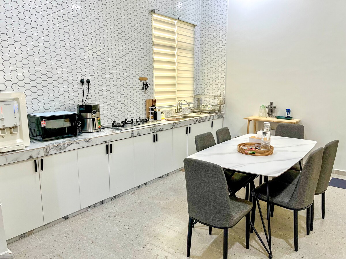 Bienvenido a Calme Luna Suite, con 4 dormitorios y una impresionante piscina orientada al frente. Situado a poca distancia del centro de la ciudad y de las atracciones de Kuala Terengganu, nuestro alojamiento ofrece la combinación perfecta de lujo y comodidad para tu escapada. Entra y descubre un interior moderno con amplios espacios interiores y exteriores diseñados para la relajación y la socialización. La sala de estar de planta abierta es perfecta para reuniones familiares, con cómodos asientos y un comedor donde podrás disfrutar de las comidas juntos.