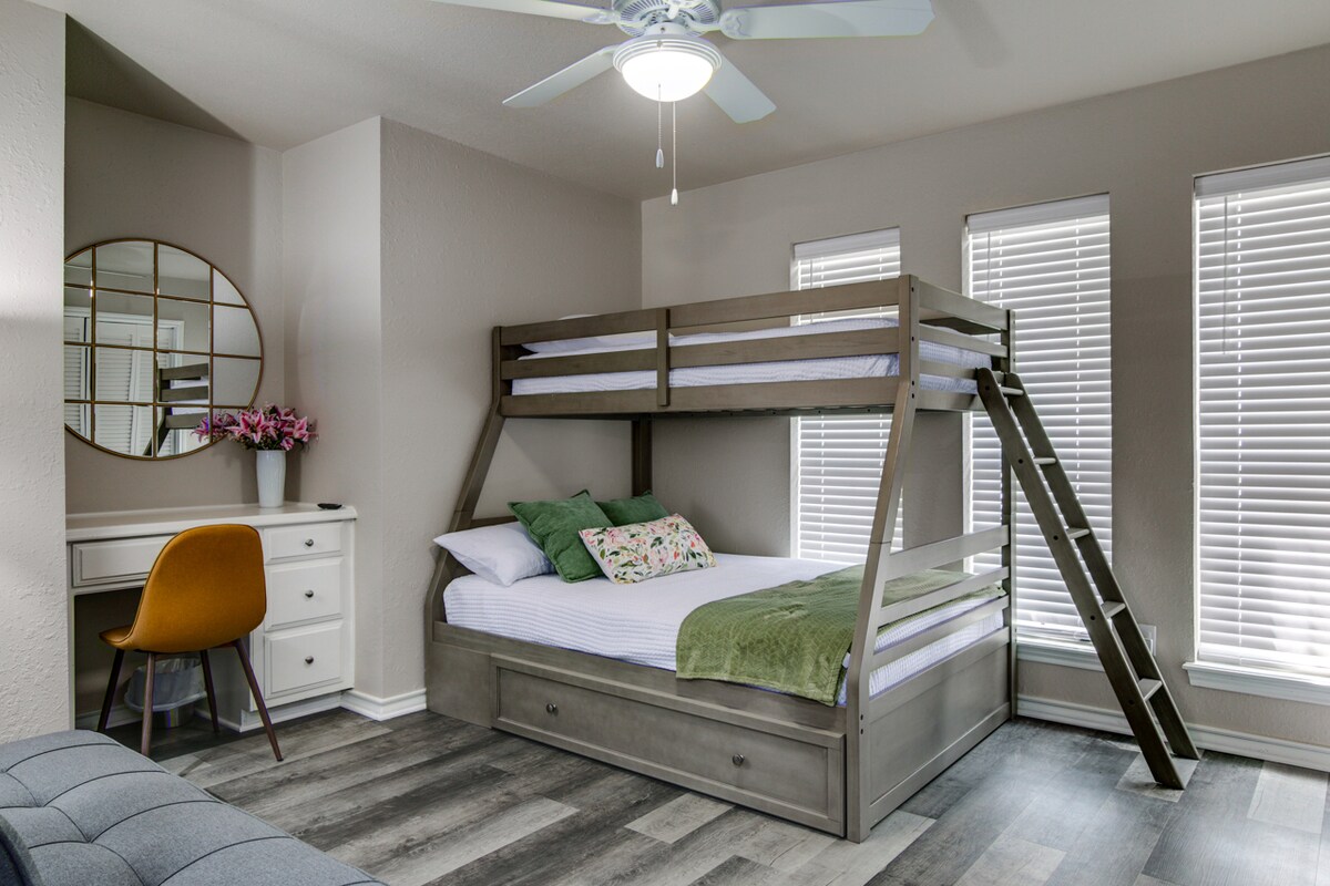 Un refugio sereno donde la comodidad se encuentra con el estilo. Sumérgete en camas de felpa con lujosas sábanas de algodón europeo de 700 hilos. Televisor en cada habitación. Te espera una cocina totalmente equipada y café para comenzar el día. A 10 minutos de hospitales, centros de convenciones, restaurantes y tiendas. Para aquellos que combinan trabajo y ocio, disfruta de un gran internet, un escritorio dedicado, una estación de carga y una cómoda silla de oficina. El garaje ofrece refugio para un vehículo y funciona como un espacio recreativo con una mesa de ping pong.