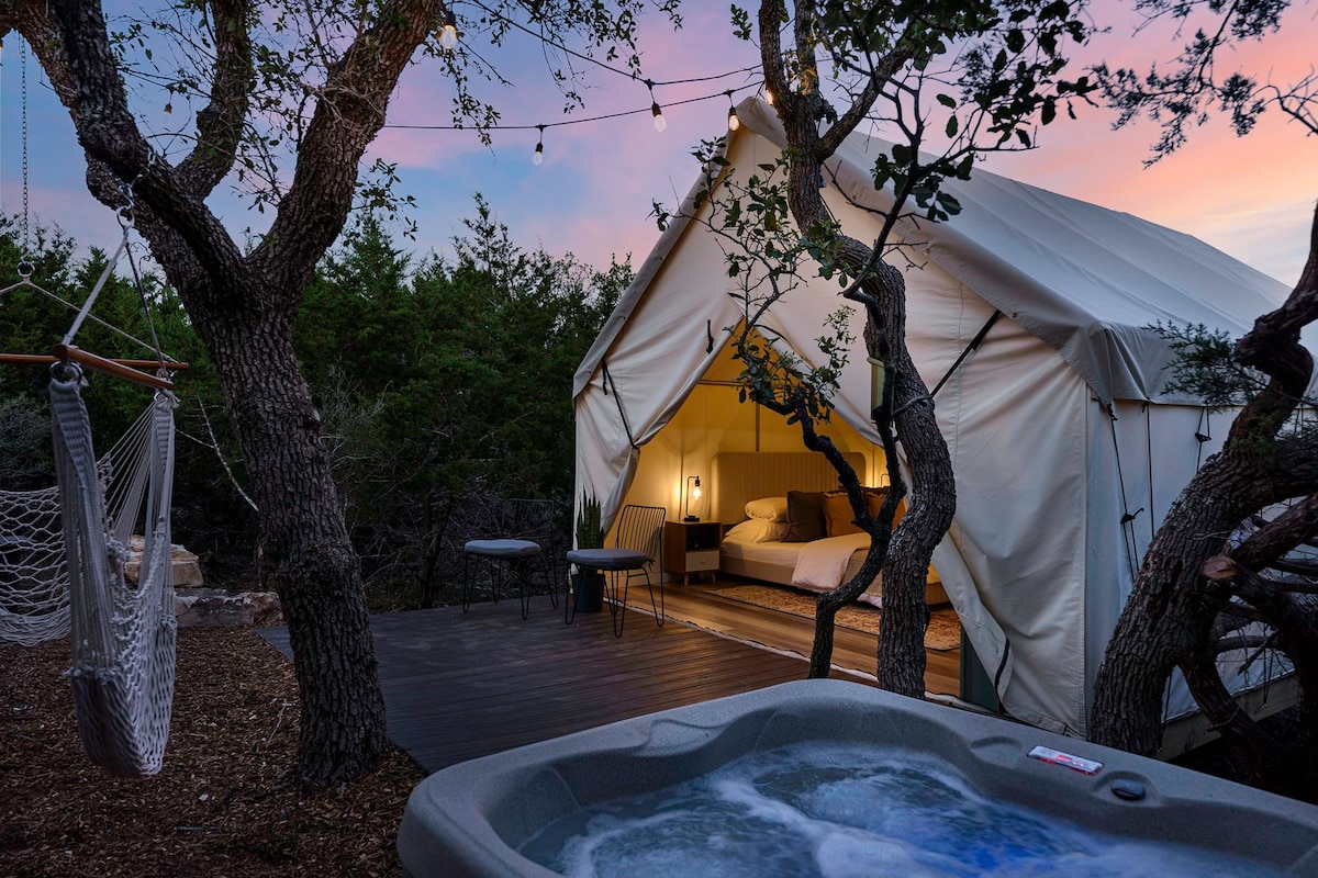 La tienda Grand Tesoro en Talula Mesa Glamping Resort (1 de 4 tiendas aquí) ¡Jacuzzi añadido recientemente! Glamping ultracómodo en una tienda/cabaña híbrida (con aire acondicionado y calefacción) = la mejor escapada. Hemos proporcionado todo lo que necesitas: tablas de remo, kayaks, juegos de jardín, una estación de cine al aire libre, chimenea, parrilla, nevera, café, hamacas, esterillas de yoga y mucho más. Grandes vistas a la región montañosa y al lago Travis te saludan en cada rincón. Acceso al lago Travis a 2 minutos. Bodega Flat Creek: 10 minutos.
