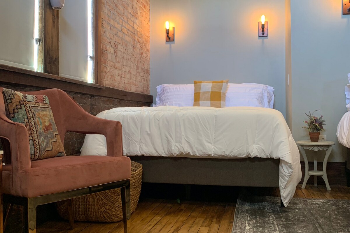 Perched on the third floor, Evanson's Loft honors another early McFarland family whose roots reflect the industrious spirit of the village's growth. This suite feels like a private apartment that is perfect for modern pioneers carving their own path. Queen bed Full kitchen Separate living room Custom bath With its elevated vantage point and added independence, Evanson's loft is especially suited for traveling professionals, digital nomads, or guests looking for extended stays.
