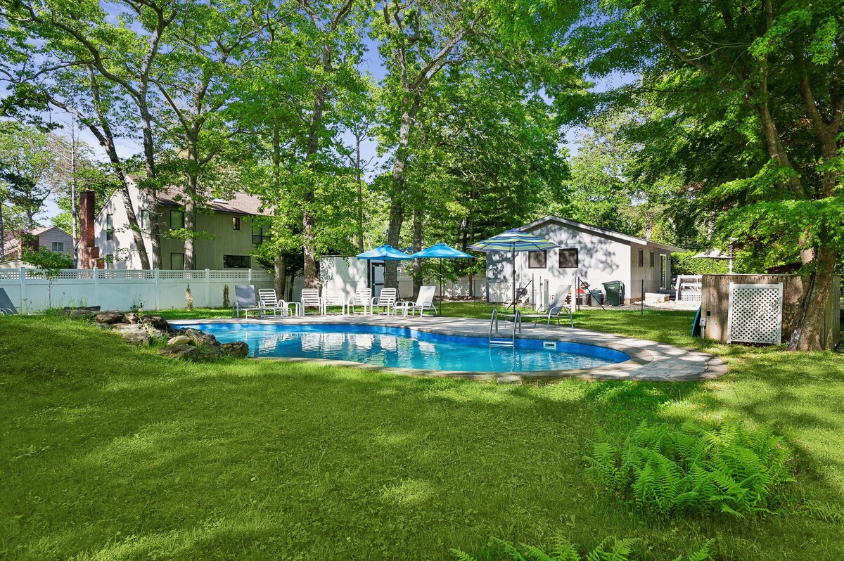 Icónico bungalow de playa y piscina de los años 70 ubicado en una parcela privada de 3/4 acres rodeada de robles maduros y árboles de hoja perenne. Nuestra casa está designada intencionalmente por diseñadores de interiores, llena de artículos de colección, arte y antigüedades. Disfruta de la sensación de ‘Hamptons Bohemia’, con una sala de estar abovedada, amplios asientos, una chimenea de leña y una zona al aire libre con una amplia terraza de cedro y una piscina climatizada. Ubicado a pocos pasos de las playas de la bahía y a 8 minutos en auto de la playa Ponquogue y The Bowl Spot para surfear.