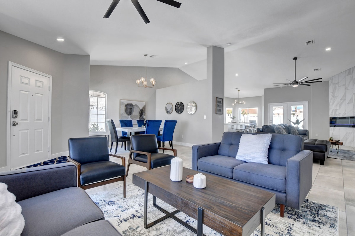 🌴 ¡Se aceptan huéspedes para estancias largas! Piscina privada + spa (calefacción del spa de cortesía), sala de cardio, electrodomésticos Samsung y mejoras modernas en todo el alojamiento. Por lo general, se tarda entre 15 y 20 minutos en llegar a The Strip, según el tráfico y el destino. Esta casa renovada de más de 223 metros cuadrados cuenta con muebles únicos, un candelabro brillante de 2,4 metros, pisos de estilo mármol y un televisor Samsung 4K de 75 pulgadas. NOTA: Este NO es un espacio para fiestas. Por favor, respete las reglas y a los encantadores vecinos.