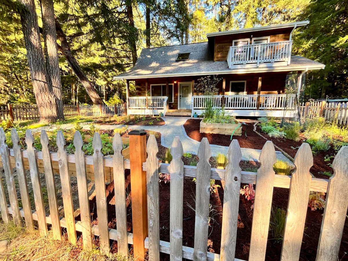 Situada a solo 13 millas de Olympia WA, esta casa de campo combina acabados artísticos y el encanto rústico de su entorno forestal. En el interior, hay una escalera de troncos única en su cama tamaño queen del loft o disfruta de la litera premium de abajo. Cuenta con una cocina totalmente equipada que incluye una nevera para vinos. El baño incluye una ducha de efecto lluvia con iluminación LED única y no te olvides de darte un chapuzón en la bañera al aire libre. Este es un verdadero paraíso solo para ti.
