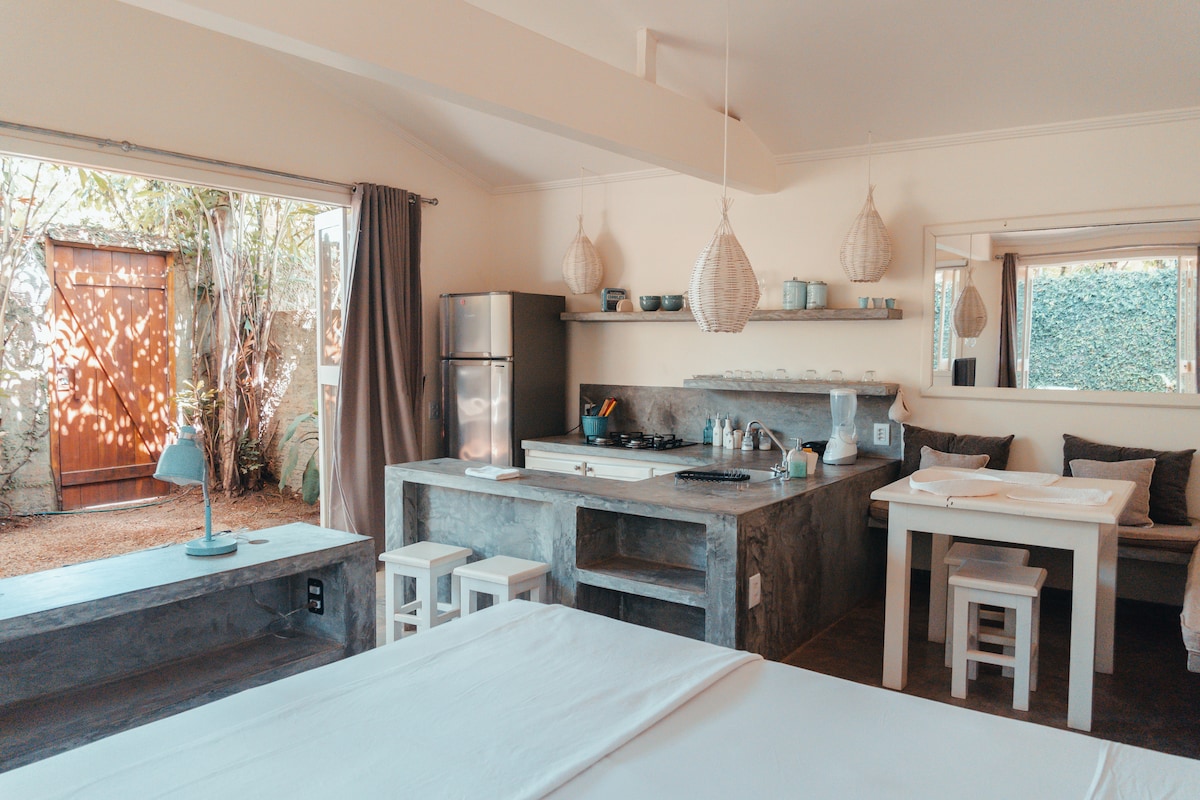 Apartamento tipo loft, primera planta, con vistas privilegiadas a la piscina central (la mejor dentro del condominio), lado de la sombra, acogedor, nuevo, con utensilios de cocina completos (nevera, cocina, microondas, tostadora, licuadora, cafetera, platos, vasos, tazones, cubiertos, tazones, tarros para alimentos), sábanas, toallas, productos de higiene, capacidad para 4 personas, ubicado en condominio cerrado (Solar Água), a 400 metros de la calle principal de Pipa (Apartamento 261)