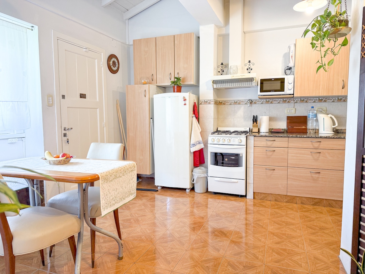 Acogedor monoambiente de 20 m² con acceso independiente, totalmente equipado, ideal para disfrutar de una estadía cómoda, funcional y con todos los servicios necesarios, cama doble y sillón cama. Cuenta con su baño privado, cocina, microondas, heladera y cafetera. TV con canales estándar y apps de streaming con cuentas listas para usar. WiFi incluido y buena luz natural gracias a su ventana con vista a la calle.