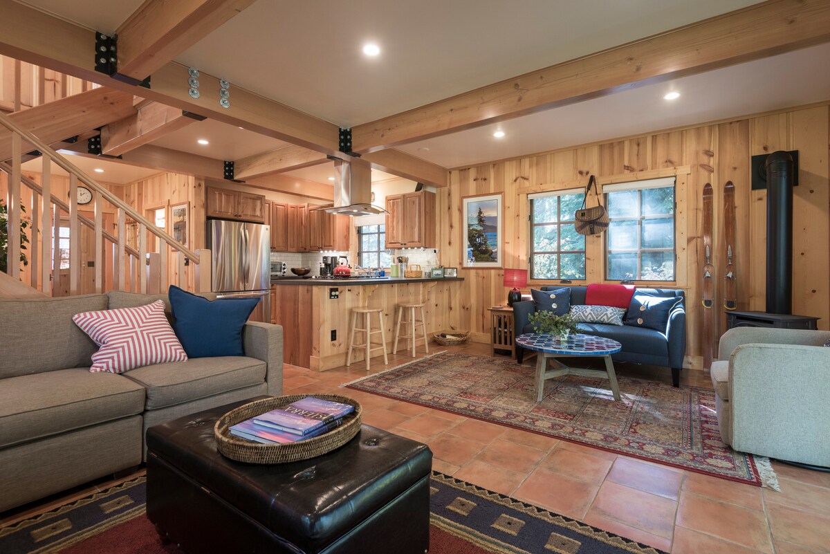 El Chalet 300 l Tahoe West Shore Cabin Esta adorable y auténtica cabaña de pino tiene todos los lujos de la vida en una casa pequeña y está a pocos pasos de Sunnyside y el lago Tahoe. Ubicada entre los pinos, exuda lo último en una visita de estilo de vida de montaña. Completamente renovada, este alojamiento de un dormitorio y un baño tiene todos los electrodomésticos nuevos en la cocina renovada, un baño nuevo, una sala de estar ecléctica y un dormitorio acogedor. Las grandes ventanas dan a los pinos y a la espaciosa envoltura alrededor de la cubierta. El lago Tahoe está muy cerca.