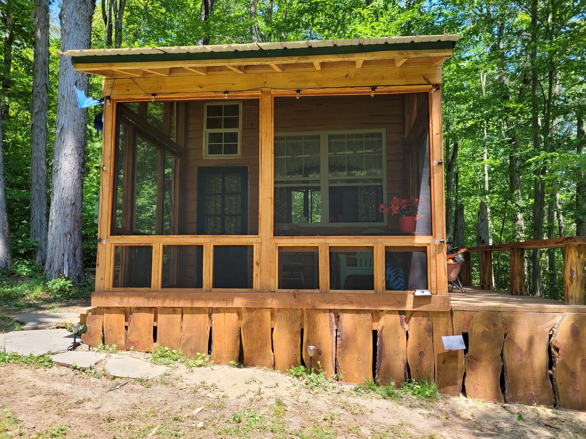 Cabaña privada en 115 acres. Tiene un gran estanque al que se puede ir caminando. Varios kilómetros de senderos. La cabaña tiene cocina y baño completo. Se accede al baño desde el exterior. La electricidad es suministrada por un generador de arranque eléctrico. Cama tamaño queen con 2 catres y todas las sábanas. Estufa de leña para calefacción. Fogata. La leña está disponible por una pequeña tarifa. Esta cabaña está muy aislada, puedes conducir por un camino de 1/2 milla hasta la puerta principal. Ven a disfrutar de la paz y la tranquilidad. {No se permiten vehículos motorizados en los senderos}
