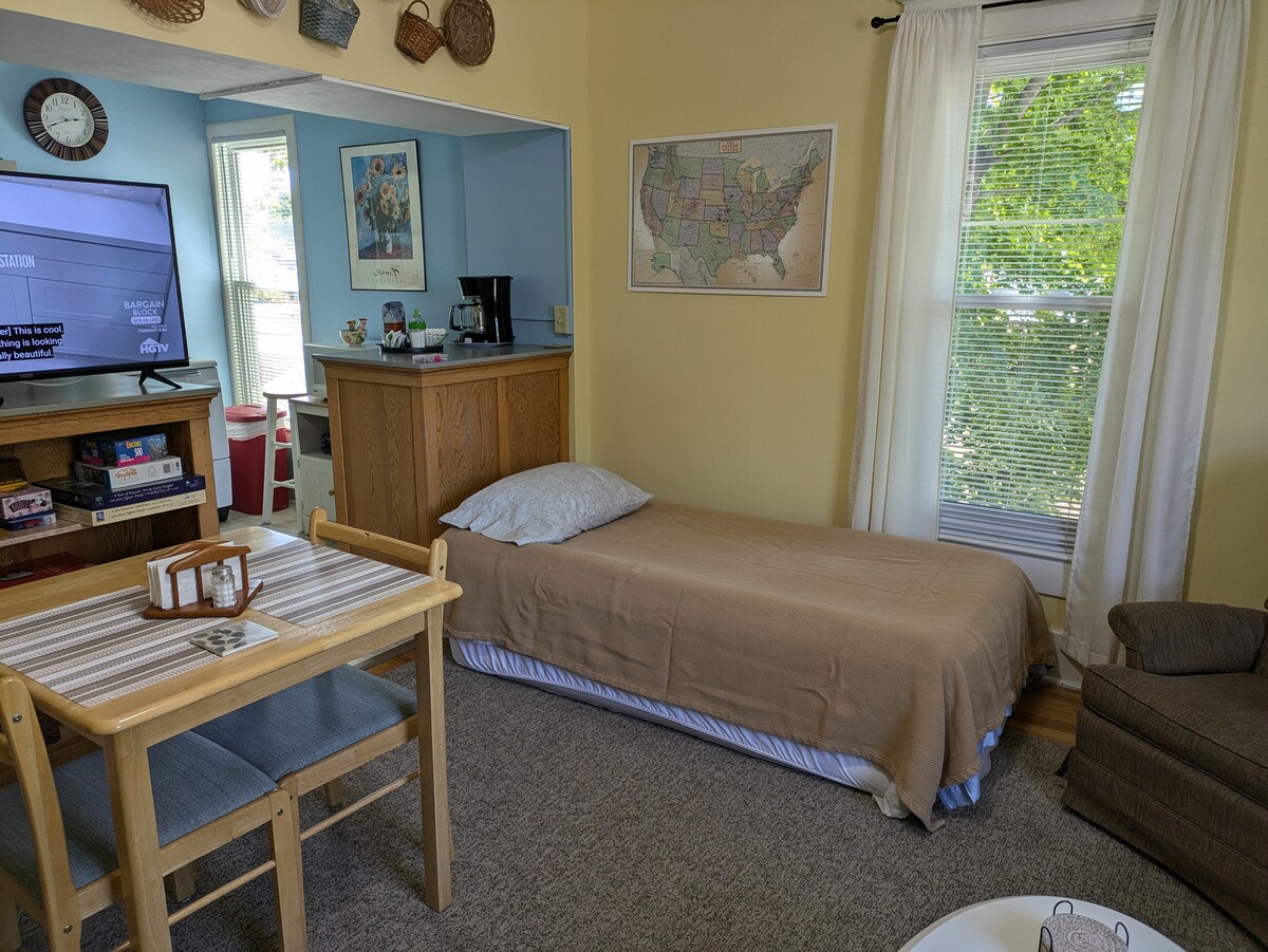 Entorno rural a cinco minutos desde la civilización. La suite independiente comparte una pared común con la casa principal. Cocina completa y lavandería. El baño principal tiene ducha para que todos los huéspedes la compartan. La cocina/comedor tiene mesa con asientos para 4. Disfruta de la terraza, los terrenos y la parrilla. ¡Mira el estanque para ver el arenque azul, los patos y los gansos mientras está en temporada! Algunas áreas exteriores están bajo videovigilancia.