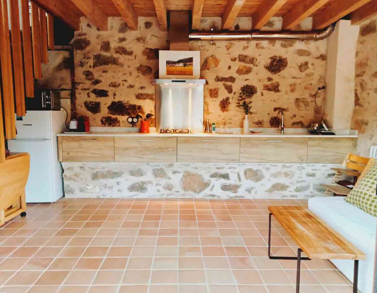 Apartamento a estrenar en una casa de 1757. Se trata de un espacio acogedor, bien iluminado, con vistas y acceso a la Medieval Plaza Mayor. Calefacción por suelo radiante y refrigeración con ventiladors. Es un alojamiento fresco en verano por ubicarse en la planta baija de una casa construída con muros de piedra encalados.