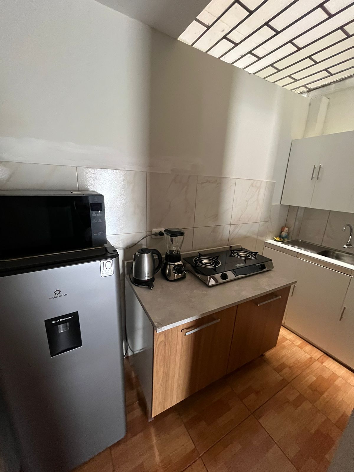 Mini Dpto. totalmente equipado, independiente, ubicado en el primer piso con 2 puertas, Una a la cochera y otra a la calle. El alojamiento es privado, confortable y práctico, con cocina, cama matrimonial para 2 personas, y un camarote con 2 camas, una sala con sofá cama, ubicado a 10 minutos de la ciudad de Trujillo, te conectamos con agencia de turismo de confianza que te pueden recoger de la casa, El lugar no es residencial pero muy cómodo.