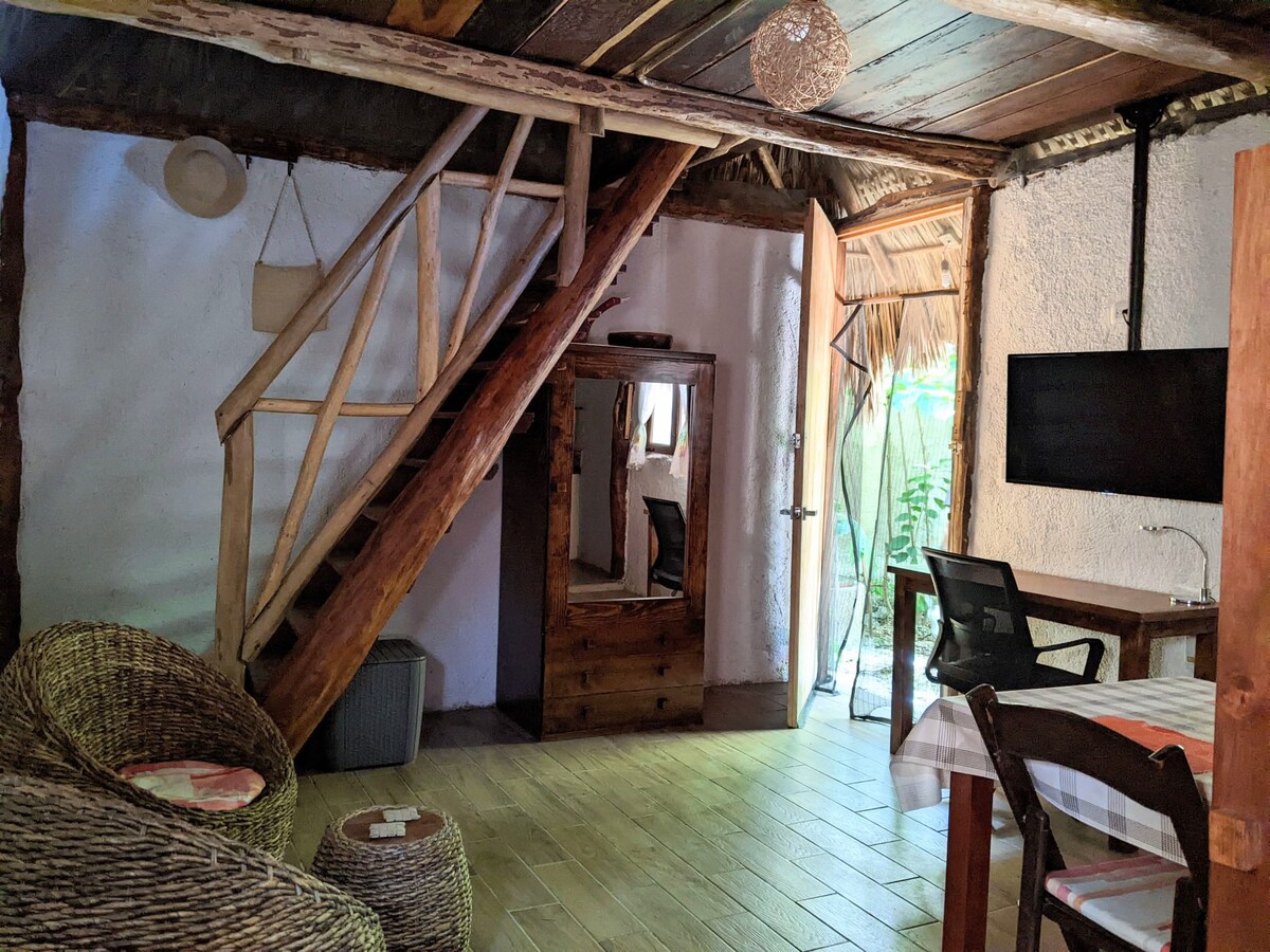 Ven a alojarte en tu propio oasis rústico en el paisaje de la Riviera Maya enclavado en los manglares de la naturaleza de Tulum. ¡Una unidad de la cabaña de la segunda planta de la mini suite de un dormitorio en una selva como el ajuste en una zona cerrada, pero todavía situada en la carretera principal de Carrillo Hwy 307/Carretera Tulum, apenas 5-10 minutos de la zona céntrica w/vistas panorámicas, 15 minutos lejos de las playas turquesas de Tulum y 20 minutos de las ruinas! Cuenta con servicio de internet de fibra óptica de alta velocidad. ¡Muchos y hermosos cenotes para visitar por el camino!
