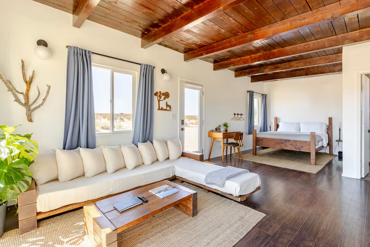 *Only 20 min from North Entrance to JTNP! Perfect retreat for stargazers and dreamers, escape the noise/chaos of the city. Not completely “off grid", yet our cabin is a great place to relax. Ideal for romantic weekends, or those seeking a creative space. Small, but functional kitchenette, mini -fridge, AC & electric heater; Queen bed, additional bed is a sofa sleeper. Cowboy pool, Fire pit, hammocks.Amazing views of desert sunrise and sunset. Come to Joshua Tree and enjoy this gem of a cabin