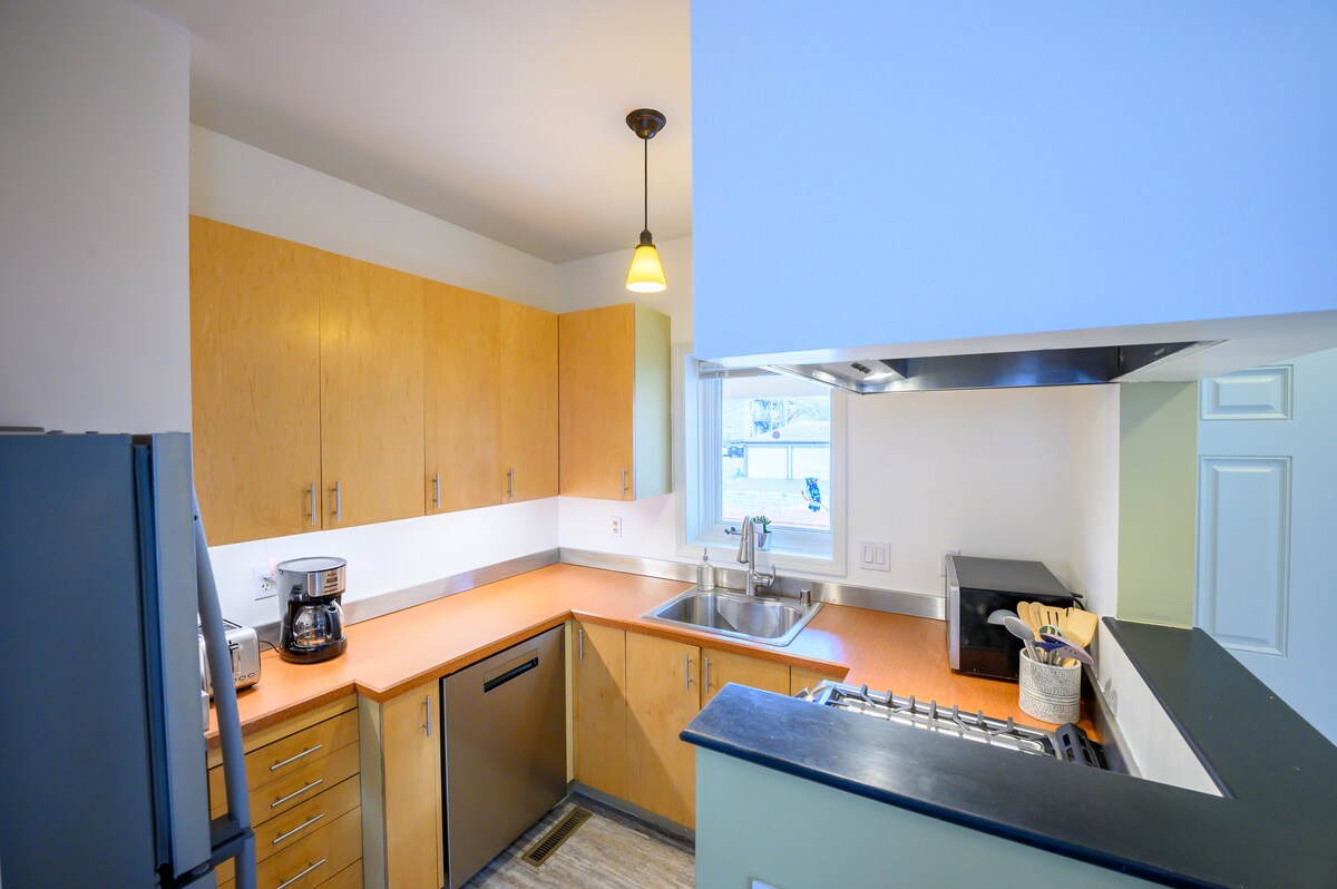 Para tu disfrute, hay un departamento limpio de un dormitorio en mi casa. Tiene su propia entrada privada, estacionamiento reservado, un lujoso baño con una bañera profunda y una cocina totalmente equipada. En el dormitorio hay una cama tamaño king y un televisor inteligente conectado a Internet para que lo uses. La casa está ubicada en un callejón sin salida en un barrio tranquilo que está cerca de todo. A pocas cuadras de la casa, hay restaurantes, tiendas y varias tiendas de comestibles.