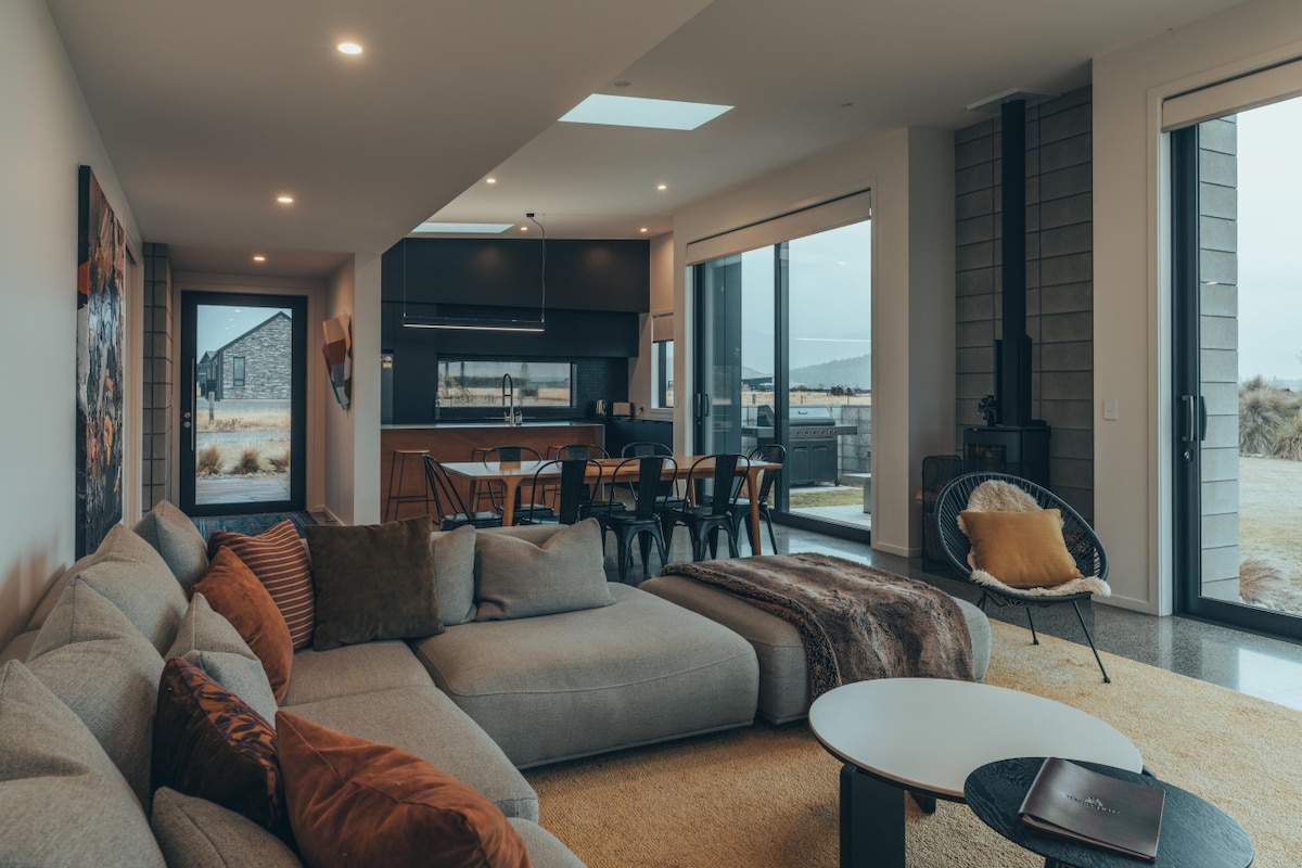 Disfruta de las vistas al lago y a la montaña mientras te relajas y disfrutas de las comodidades de esta nueva casa de diseño arquitectónico. Relájate junto al fuego mientras te relajas y disfrutas de la sensación de una cabaña rural con un toque moderno. Disfruta del campo de Mackenzie con paseos por el monte, ciclismo de montaña, pesca y, por supuesto, el campo de esquí Ohau a solo 20 minutos de la casa. La propiedad es perfecta para un fin de semana con familiares y amigos o una escapada romántica para dos. Capacidad para 7 personas