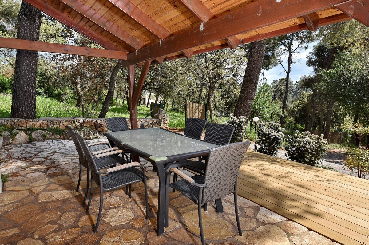 Una hermosa villa rodeada de bosques y naturaleza , con capacidad para hasta 7 huéspedes. Dos dormitorios dobles, cada uno con baño privado y una sala común con 3 sofás cama. Un jacuzzi privado en el balcón y mucha paz y tranquilidad.