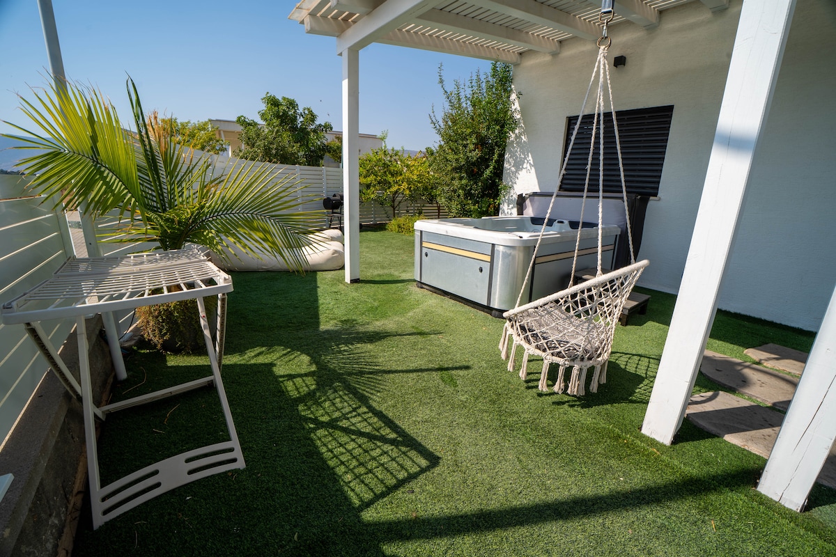 Este espacio amplio y tranquilo se olvidará de cualquier duda. Una gran cabaña de madera romántica con patio privado, árboles ,flores y mucha tranquilidad. En cabaña de dormitorio independiente con cama doble, Amplia sala con sofá cama para una cama doble, Smart TV TV TV, ventana de patio, Leer libros, juegos y manualidades . Una cocina totalmente equipada en un refrigerador grande,horno , hervidor eléctrico y cafetera exprés. Porche delantero con vistas a la montaña y al mar de Galilea. Jardín trasero con piscina para remar, jacuzzi , sala de estar y tumbonas.