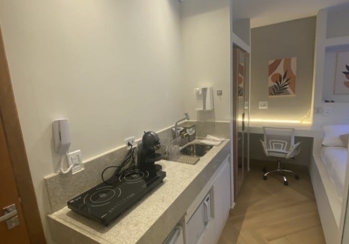 Privativo, aconchegante e funcional, ideal para quem busca conforto, praticidade e total privacidade durante a estadia. Totalmente exclusivo para o hóspede, com cama confortável, cozinha, bancada para refeição, estudos ou trabalho, sofá cama, TV e banheiro proporcionando uma experiência tranquila e segura. Apesar de estar conjugado a um salão de estética, o ambiente do hóspede é de uso exclusivo, garantindo privacidade e autonomia durante toda a estadia.
