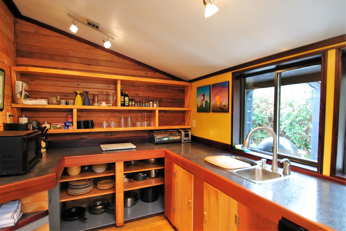 The Haidaway cottage at gold coast retreat has an ideal location, just across from the beach path to famous Chesterman Beach, with 2 km. of open surf & sand. The village of Tofino is 6km away by car or bike path . We offer total privacy in a tranquil setting on a warm south facing property. Chesterman Beach is only a 2 minutes walk, you can fall asleep with the soothing sounds of the surf. We accept only one small non-shedding dog at the rate of 50 dollars and no pets in July and August.