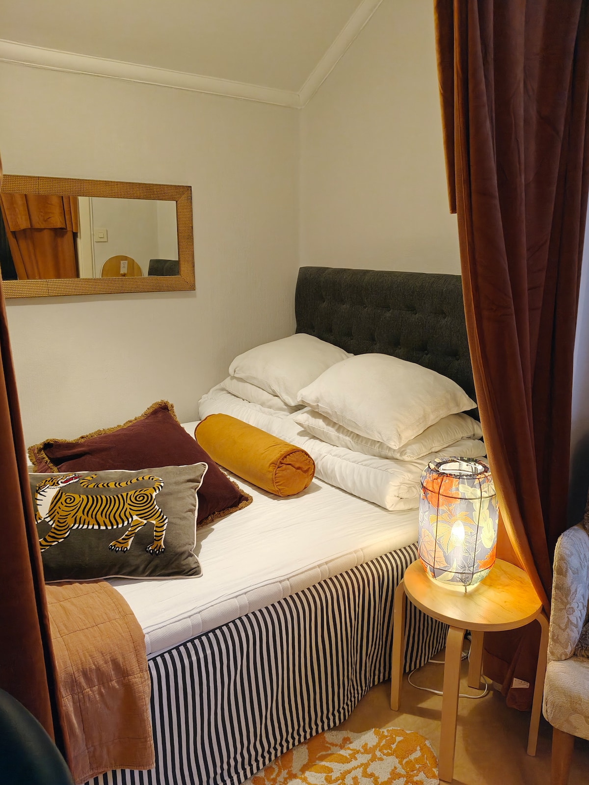 Vi erbjuder en ljus och nyrenoverad vindsvåning på ca 30 kvm. Lägenheten är inredd med de bekvämligheter som krävs för ett bekvämt boende för upp till två personer. Mysigt kök med ny kyl/frys, spis och ugn samt micro med köksartiklar. Nyrenoverat badrum. 160cm säng, sittsoffa samt en fotölj. 55" smart TV, WIFI. Lägenheten har smidigt kodlås för er bekvämlighet. Gästen ansvarar för städning innan utcheckning. Er host bor i samma hus och är tillgängliga vid frågor.