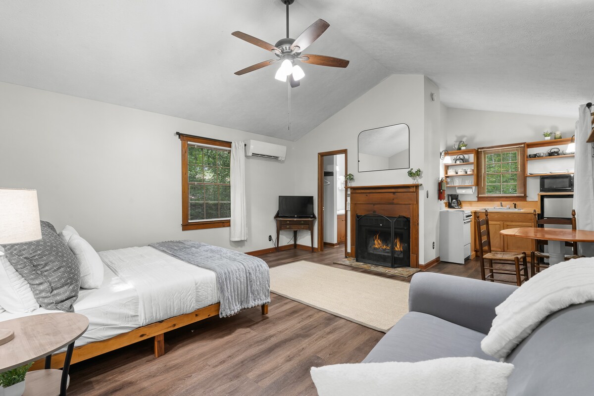 Nestled among tranquil trees in Blairsville, GA. This cozy studio cabin is perfect for couples or solo adventurers, with easy access to scenic hiking trails, waterfalls, & towns of Helen & Blue Ridge. The cabin sits on a wooded hillside & is reached by outdoor steps to the entrance, adding to the peaceful mountain setting. Relax in the open studio with fireplace & kitchenette, or unwind on the porch rocking chair and breathe the fresh mountain air. Ask about our other cabins for group getaways.
