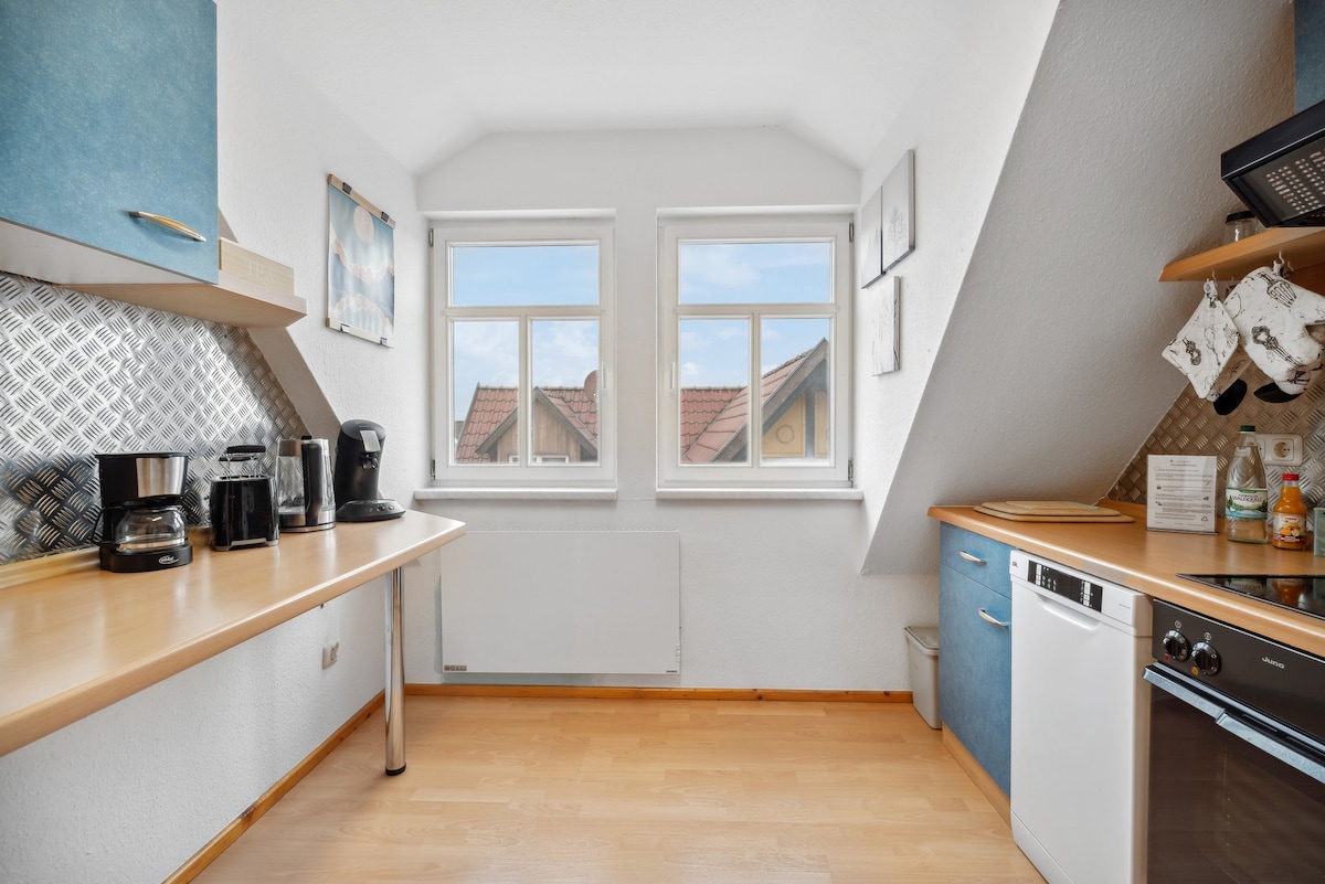 Helle, freundliche Dachgeschosswohnung. Es gibt ein Doppelbett und ein Reisebett für Kleinkinder im Schlafzimmer und eine Couch im Wohnzimmer. In der geräumigen Küche kann in gemütlicher Runde gegessen werden. Im Bad gibt es eine Badewanne mit Duschabtrennung. Die Wohnung befindet sich im Haus meiner Mama. Sie kümmert sich um die Schlüsselübergabe. Bei Buchung mit Hund fallen 5 € zusätzlich pro Tier und Nacht an. Bitte die Kurtaxe in Höhe von 2,50 € pro Person bar vor Ort bezahlen.