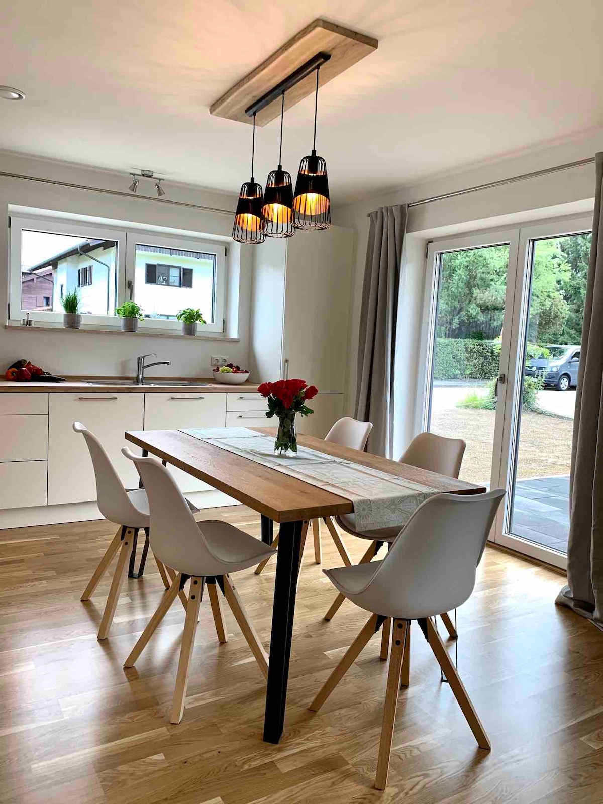 Ofrecemos una casa de madera muy especial con sauna de barril justo a las puertas de Algovia. Con una ubicación céntrica para hacer numerosas excursiones o simplemente pasar unos días agradables en una casa construida y amueblada de forma sostenible. ¡No se dejará ningún deseo por cumplir! Cocina Bulthaup totalmente equipada, con una gran mesa de roble macizo en el centro. En la terraza, una barbacoa de carbón espera a ser encendida y, en el gran jardín, la cama elástica y la chimenea hacen que los corazones latan más rápido.