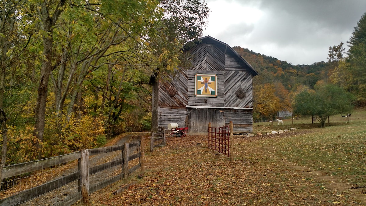 Kevin built our barn a while back. Airbnb didn't exist and we were excited to be starting a goat dairy. Now the kitchen sits where we used to milk our sweet goats by hand! Kevin, a woodworker has created a work of art. We are happy to offer our guests a vacation space located in the heart of the mountains, 30 minutes from Asheville. 28 acres offer trails for hiking, disc golf, swimming in the pond, and decompress from your life's stress. We have Fiber Optic Wifi for calling & streaming.