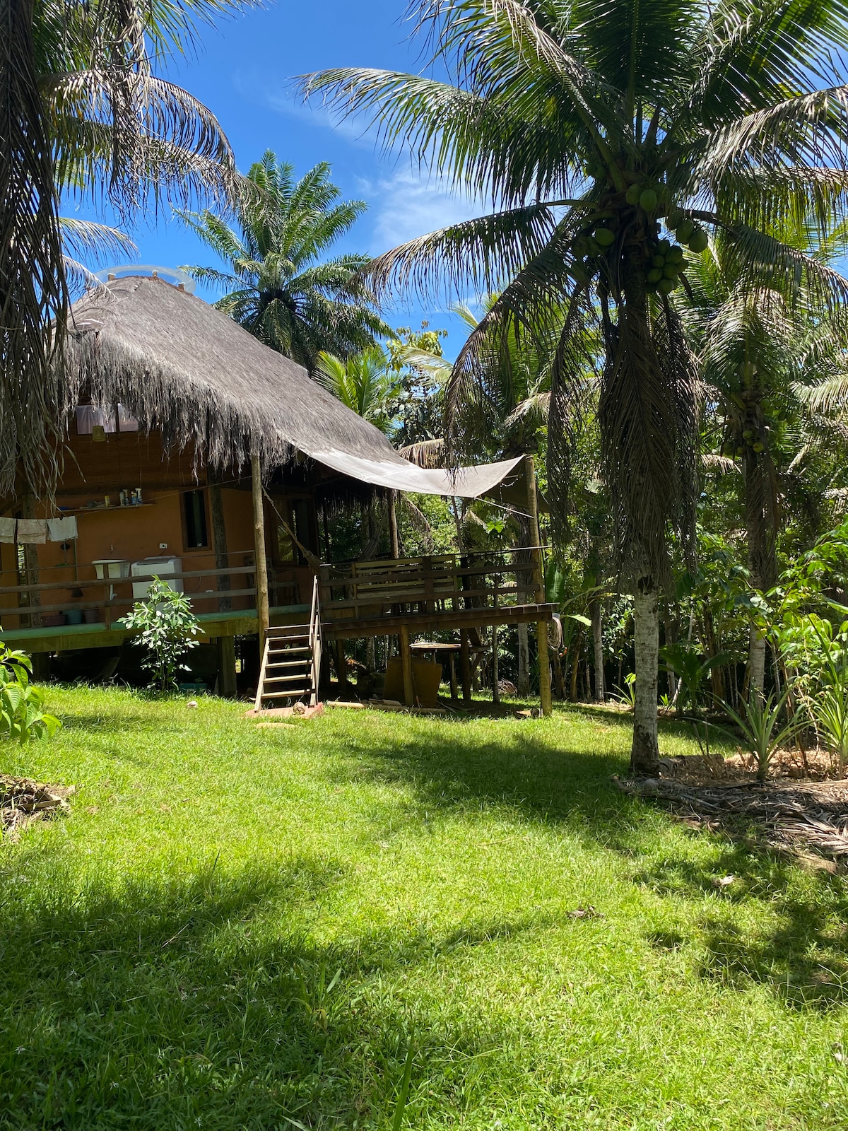 Chalé em madeira de lei com 3 andares, todo avarandado e em exclusivo projeto arquitetônico hexagonal, e com linda cobertura de piaçava, permitindo muito conforto, em sítio à apenas 5 minutos de carro da vila, com vista para a Mata Atlântica preservada do parque do Conduru. Pra voce que quer a vida calma da mata , a praticidade da área urbana próxima, e inúmeras lindas praias da região! Os 2 colchões são ortopédicos orthobon de alta qualidade!
