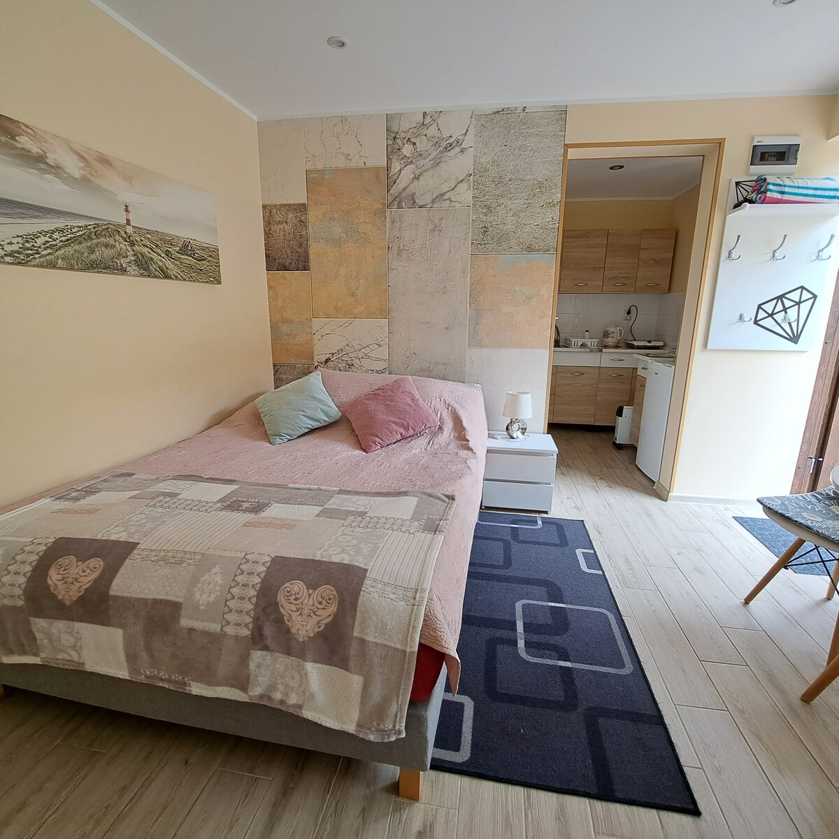Un apartamento moderno, espacioso y cómodo en el complejo «Platany» ubicado en la isla de Solna en el mismo centro de Kolobrzeg. El apartamento con balcón y hermosa vista al canal Drzewny se encuentra en el 5º piso de un edificio equipado con ascensor. Adecuado para un máximo de 4 personas, es la opción perfecta para unas vacaciones con amigos o familiares, así como para trabajar a distancia. Para los padres que viajan con niños pequeños, también hay disponibles una cuna y una silla alta (bajo petición).