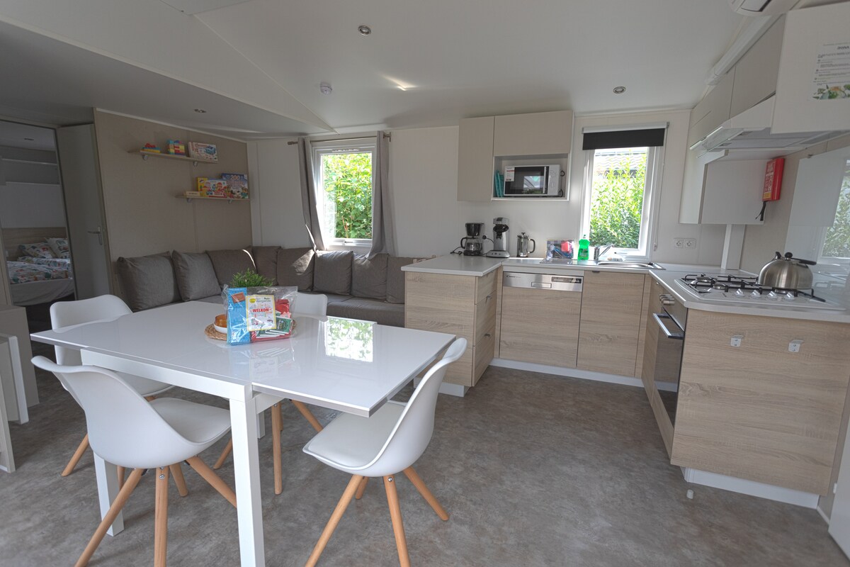 Chalet para 6 personas (recién colocado en 2022) en el agua de pesca. Ubicado en el camping de Vergarde. El uso de las instalaciones para acampar está incluido en el precio. El chalet tiene 10,62 x 4 metros con un espacio de estacionamiento privado junto al chalet, una terraza con sol y un lugar de pesca privado en el agua. El camping cuenta con restaurantes (solo abiertos en temporada de vacaciones) y piscina (abierta de mayo a agosto)