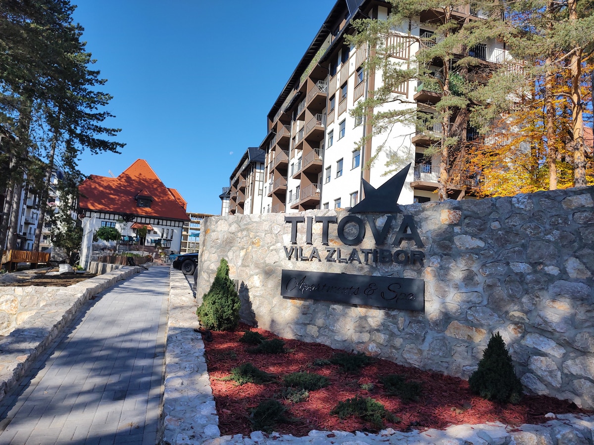 Relájate en un maravilloso apartamento en el hermoso complejo de apartamentos Titova Vila rodeado de un bosque de pinos. Cerca del centro, pero lejos del ruido. Disfruta del aroma de la naturaleza, relájate en el centro de spa y disfruta del parque infantil al aire libre con los niños. Abre la puerta y entra en un auténtico y moderno mundo de montaña, un lugar pintoresco lleno de historia, a una altitud de más de 1000 metros, con una fantástica vista de los picos de las montañas Tornik y Chigota.