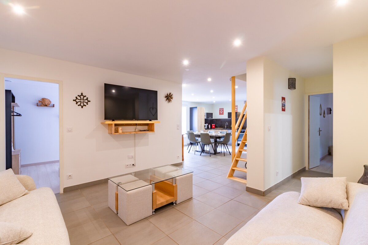 El apartamento se encuentra en la planta baja de nuestra casa. Es independiente de la 1.ª planta donde vivimos, de una sola planta, y ofrece una hermosa terraza cubierta, orientada al sur. Nuestra casa se encuentra en una zona residencial muy tranquila, cerca del centro de la ciudad de Saint-Affrique y de todos sus servicios.