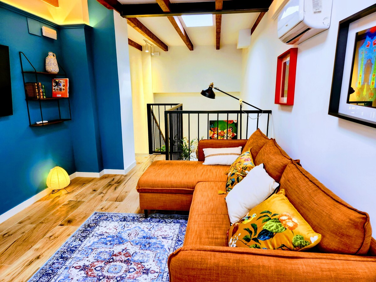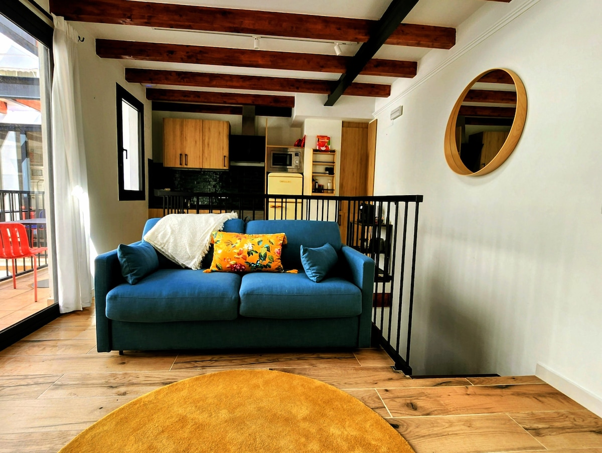BUBU 2 es un LOFT DUPLEX situado en el corazón del centro histórico de Valencia, junto al Mercado Central y la Plaza Redonda. Ubicado en un antiguo edificio totalmente rehabilitado, su estructura de techos altos, vigas de madera, balcón luminoso con muebles de jardín y estructuras de hierro le dan un look industrial que nos hace recordar a la estética de los antiguos lofts de NYC. Este duplex de concepto abierto hará que te den ganas de quedarte a vivir en él.