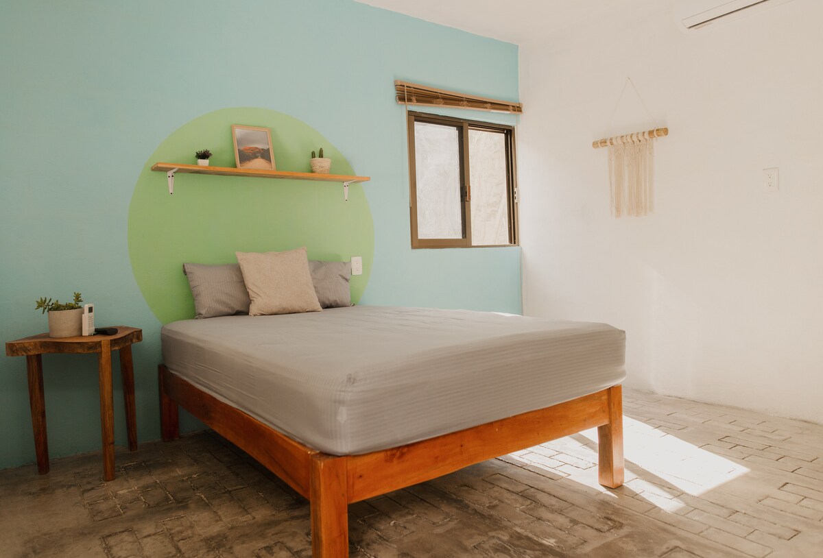Relájate en este espacio tranquilo y elegante a tan solo 3 minutos caminando del ex convento San Bernardino de Siena y la Calzada de los Frailes en Sisal. Nuestro espacio está diseñado para que tengas todas las comodidades y poder disfrutar de Valladolid. Cuenta con: -Estacionamiento. -2 camas matrimoniales. -Aire acondicionado -Agua caliente. -Frigobar. -Cafetera con café incluido. -Televisión -Wifi. -Plancha. -Secadora para cabello. -Baño privado con samphoo, jabón para cuerpo y toallas.