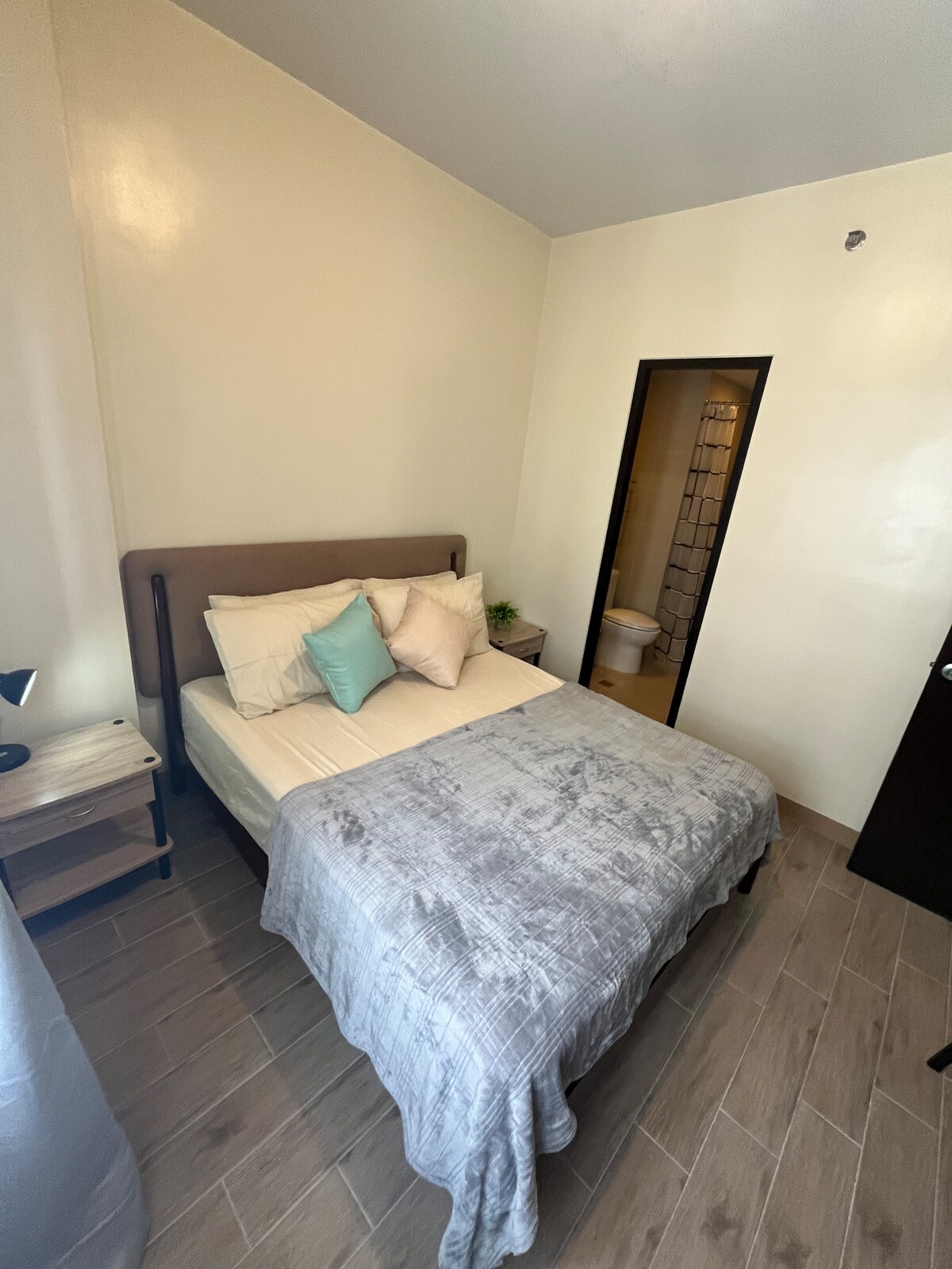 Perched on the 16th floor, this cozy studio offers sweeping views of Bacolod’s skyline and sea. Wake to golden light streaming through the window, unwind under a chandelier of stars, and rest in soft linens. A warm wood desk invites work or journaling. Perfect for solo travelers or couples seeking serenity above the city—compact, calm, and unforgettable.