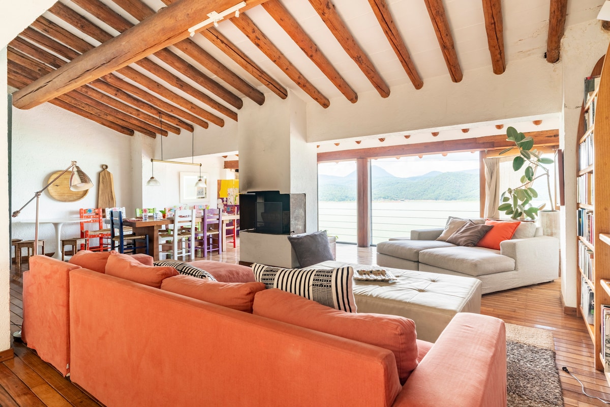 Casa con vista al lago y a las montañas, en medio del bosque, con un jardín propio de 5,000 m2, alberca privada con calefacción y gimnasio privado; ubicada en un fraccionamiento con seguridad las 24 hrs. Diseño arquitectónico en desniveles con techos altos a dos aguas, vigas y columnas de madera, teja roja, barro y madera. Decoración con elementos tradicionales de una casa mexicana contemporánea. Excepcionalmente iluminada con vistas al bosque y jardines desde cualquier ventana.